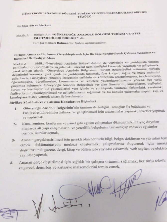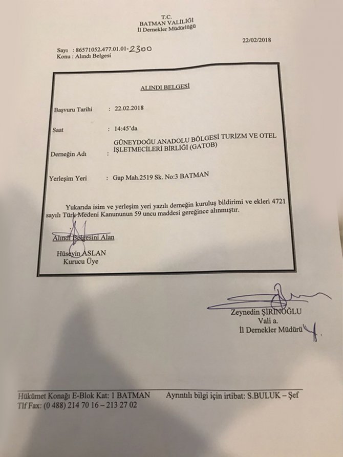 02 Nisan Pazartesi günü Dernekler Masasına giderek hakkımda “HAYALİ Başkan’ın işi bitti” başlıklı haber TÜRKİYETURİZM.COM'da yapılmıştır. Dernekler Başkanı Zeynettin Şirinoğlu’na haber ve yazılanlarla başvuru yaptım . Dernekler masası Başkanı Zeynettin Şirinoğlu bana (Güneydoğu Anadolu Turizm ve Otel İşletmeleri GATOB) Dernek kuruluşa mazbatamı verdi. Bize bu dernek kuruluşu ile ilgi başvuru yapıldı kabul ettik dedi.